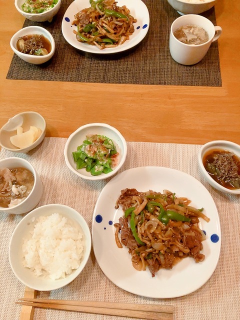 牛肉玉ねぎピーマンしめじ甘辛炒めと、コストコのあわび粥